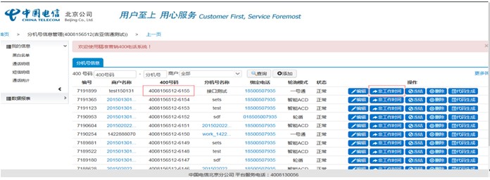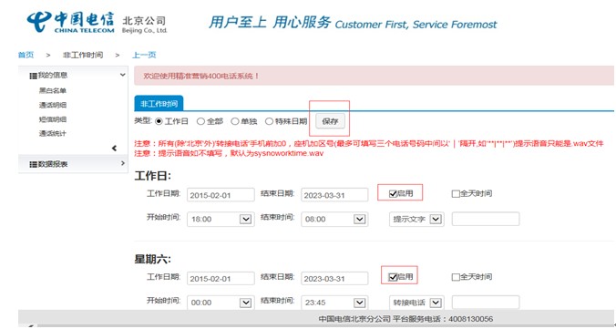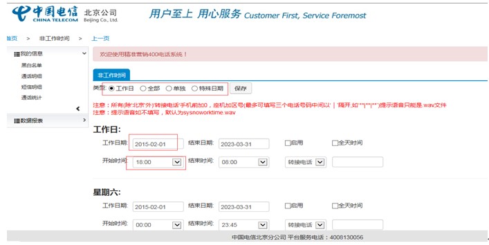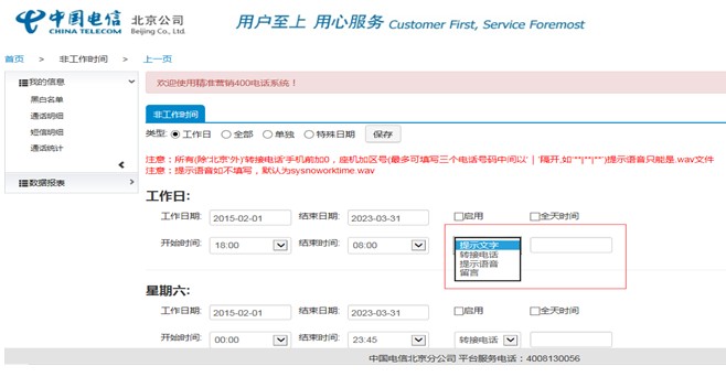 登陆精准营销系统后台,点击“分机号管理”; 第一步,选择需要设置的分机号,点击“非工作时间”; 第二步,选择设置类型,填写非工作日期时间; 第三步,选择转接类型,提示语音类型在后面空框里填写上传提示音的文件名。 如:4008156512.wav 第四步,设置完成,点击启用,然后保存。 注明: 转接类型: 提示文字,后面空框里填写汉字,电脑会自动播报成语音。 转接电话,后面空框里填写电话号码,非工作时间将来电转给填写的电话号码。 提示语音,后面空框里填写上传提示音的文件名,非工作时间直接播报此提示音。 留言,后面空框不需要填写任何东西,非工作时间默认留言提示音,提示客户留言。 |