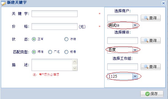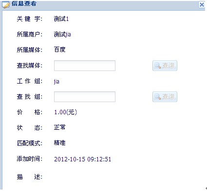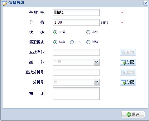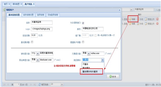 媒体配置关键字设置—根据企业在媒体推广中设置的关键字进行系统设置1.例如:进入“关键字设置”界面,点击“新建关键字”,进行新建关键字,如下图: 新建关键字时添加“关键字”,选择好要绑定的商户,媒体,工作组。 2. 媒体配置完成后,进入“商户”登陆平台,在“我的资料”中点击“生成呼叫代码”如下图: 复制 JS代码,将代码设置到商户要宣传的网页中即可实现媒体配置 3. 点击“查看”,可以看到关键字的详细信息。如下图: 4. 点击“修改”,修改关键字的信息,点击“保存”。如图 5. 点击“删除”,弹出确认是否删除对话框,点击“确认”则删除,点击“取消”则不删除。如图 6.设置接线员提示音,商户——》基本信息——》编辑——》竞投媒体。如图 |