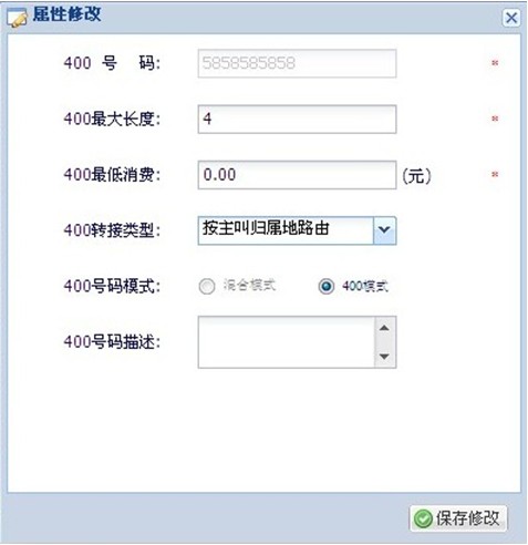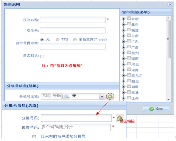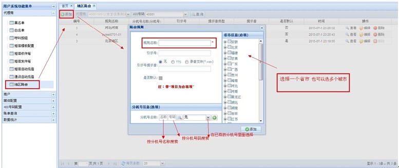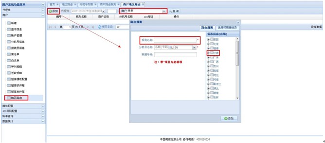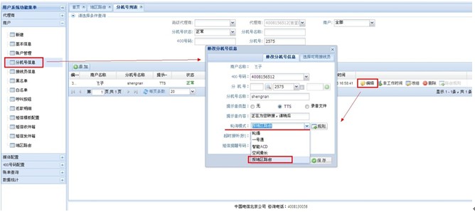 区域路由操作流程 地区路由,是指系统根据主叫归属地自动呼转到相应地区的接线员。 路由类型 :①直拨400号码后,系统自动判断归属地进行路由; ②拨400号码转分机号后,系统再根据主叫归属地进行路由; 地区路由简易设置流程: 一、①直拨400号码后,系统自动判断归属地进行路由; 1、管理员设置: 400号码配置→400号码设置→属性修改→400转接类型 选(按主叫归属地路由);见图 此属性修改需联系管理员。 2、代理商后台设置: 代理商→地区路由→添加→规则名称(尽量添加容易区分的,例如:北京、上海、广州等等)→分机号名称(选择要添加的路由分机号)→添加;见图 3、路由规则填写明细: 规则名称:可设置地区名称等易区分易查询的信息 引示号:对于同一个400大号可以设置不同的引示号进行语音区分。 引示号提示音:主叫直接拨打引示号听到的提示音 是否默认□:勾选后,主叫属于未设置规则的地区电话时,会直接转给默认规则的接线员接听。 分机号信息(选项):可根据分机号名称和分机号查询设置,没有所要设置的分机号码时,点击下图 进行添加,见图 注:一个地区只能设定一个规则,一个规则可选择多个地区。 二、②拨400号码转分机号后,系统再根据主叫归属地进行路由; 1、代理商后台:商户→分机号信息→编辑(选择所要设置的分机号)→轮循模式(选择 按地区路由)→保存。点 可以进入到(图5)、(图6)界面进行设置。见图 2、代理商后台:商户→地区路由→选择商户→添加→规则名称(尽量添加容易区分的,例如:北京、上海、广州等等)→分机号名称(选择要添加的路由分机号)→添加;见图; 注:同一个分机号下面不能有重复的规则; 转接号码:如果“选择可用接线员“中没有可选择的接线员时,可以在此转接号码框中输入转接电话直接添加; 3、接线员的设置明细,见图 可选接线员中,只显示前10个接线员(避免数据过多影响查询速度),未显示的接线员可以通过接线员号码进行查询,再添加; |