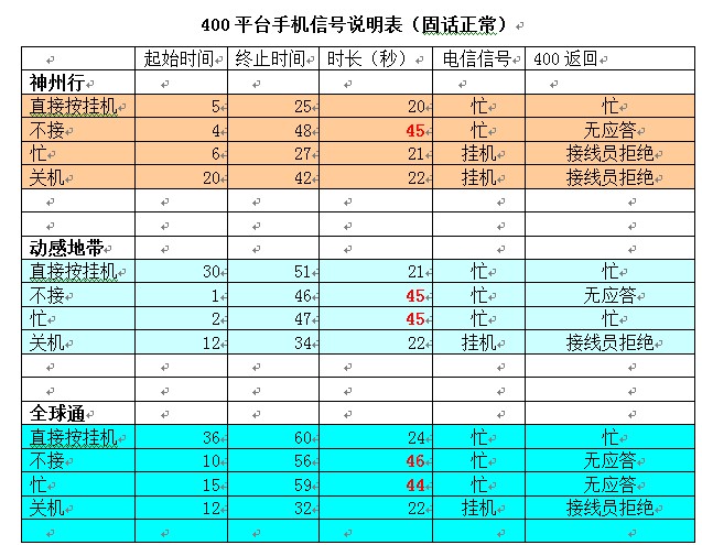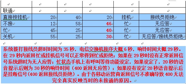 1、三种接线员轮循的具体规则: 智能ACD:系统按照接线员上一次接电话的比重(通话时长*0.4+次数*0.6)计算出那个接线员的比重较少,再有电话就先到这个接线员。 空闲较长:每次电话先到离上次接电话时间较长的那个接线员 一号通:每次来电先到第一个接线员 这三种轮循,在第一个电话占线到轮循到第二个接线员电话响铃的时间是:如果上个接线员是固定电话,则可以立即判断占线转给第二个接线员;如果上个接线员是手机,则需要看手机运营商返回忙线的时间是多长了(神州行21秒、动感地带45秒、全球通44秒、联通40秒)具体的数据见下表! 2、主叫用座机拨打400分机后, 座席拒接 ,但主叫还在呼叫中? 如果座席是手机,手机在 “不在服务区“”已关机“”直接拒绝“情况下,移动联通电信都不给信号,而是给提示语音,大约25秒后才给忙信号,系统才能识别,导致主叫这边还是响铃音。(联通20秒、 神州行20秒、 全球通24秒、 动感地带21秒,详细请见上表) |