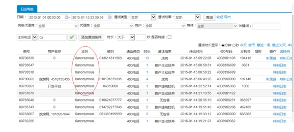 日话明细里主叫电话为英文单词或者乱码是什么原因? 在主叫电话为网络电话或者设置了隐藏号码的功能时,系统拿不到主叫的电话,语音平台电信接入设备会替换成匿名电话(0anonymous这个单词是匿名的意思) 和手机上有时看到未知号码来电一个道理。 |